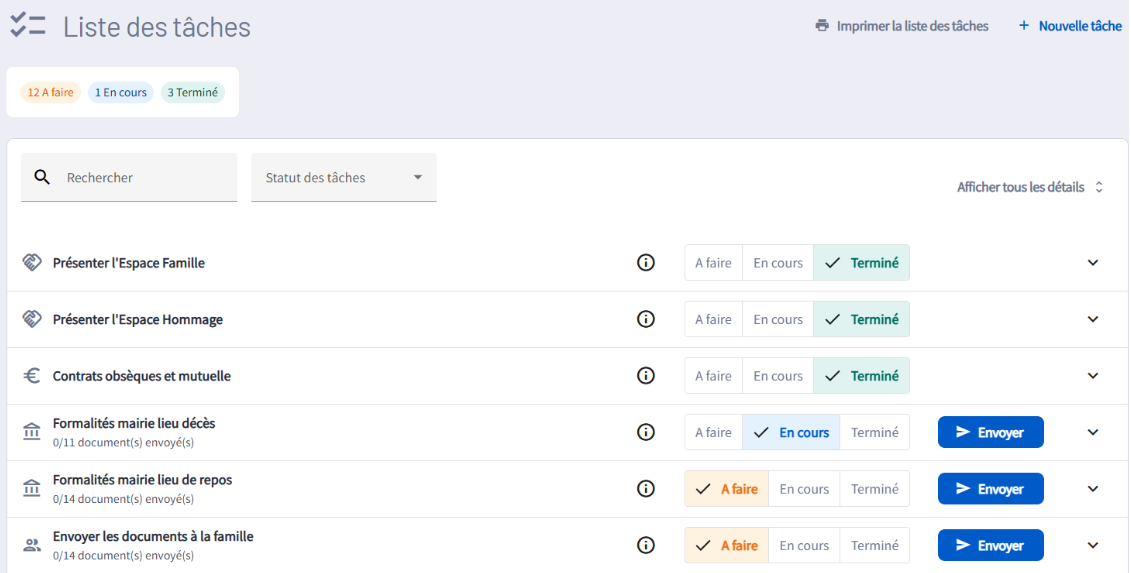 Le logiciel Simplifia propose également une liste de tâches intelligente et 100 % personnalisable. Véritable « pense-bête » numérique, cette checklist se génère automatiquement dès la validation de la commande. Elle tient compte du contexte et elle s'adapte au type de dossier (obsèques, marbrerie, contrats).