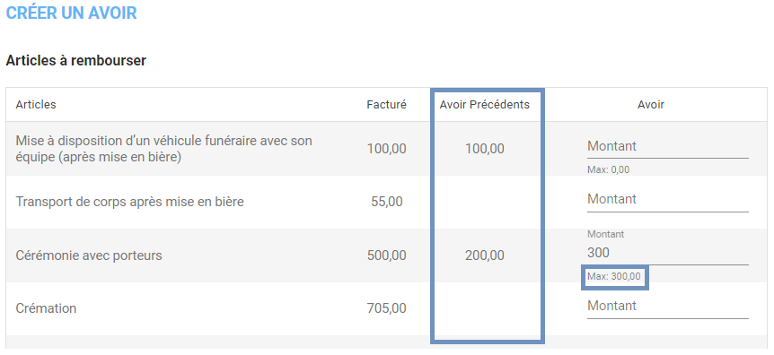 Lors de la saisie d'un second avoir, une aide est désormais affichée. Une nouvelle colonne "Avoirs précédents" s'affiche afin de vous indiquer les avoirs faits au préalable.